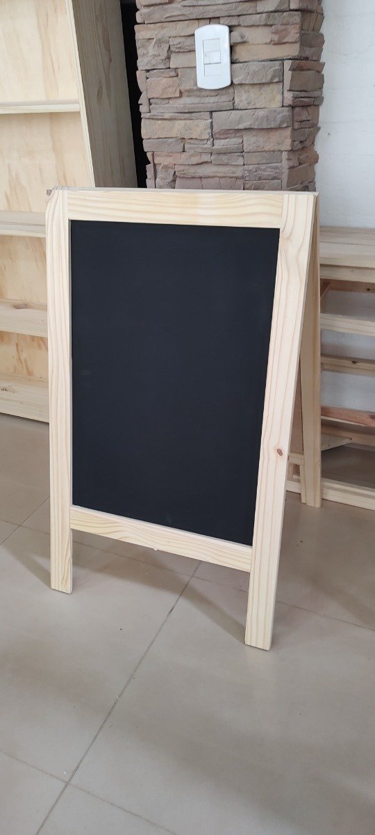 Su marco de madera de pino maciza le da un aspecto rústico y simple, ideal tanto para uso comercial como doméstico. El pizarrón, fabricado en MDF, es liso y resistente, perfecto para escribir con tiza de forma clara.