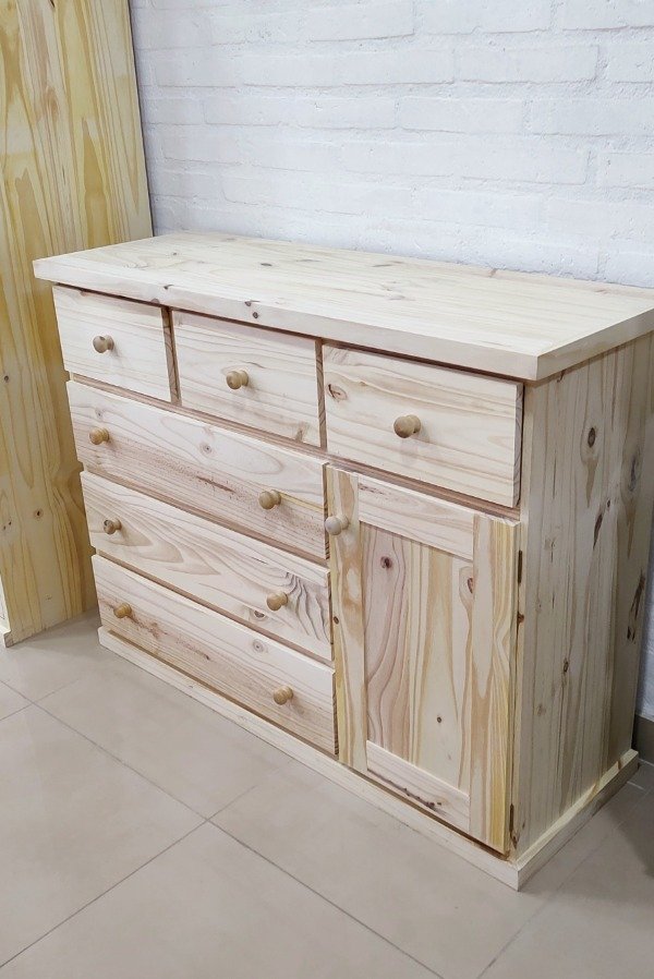 Cuenta con una serie de cajones amplios en un lado, perfectos para guardar ropa, accesorios o artículos más pequeños de forma ordenada. En el otro lado, una puerta mas pequeña que oculta un espacio de almacenamiento adicional ideal para objetos más voluminosos.