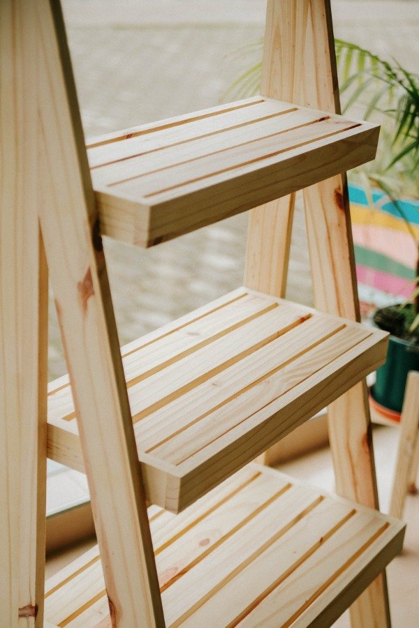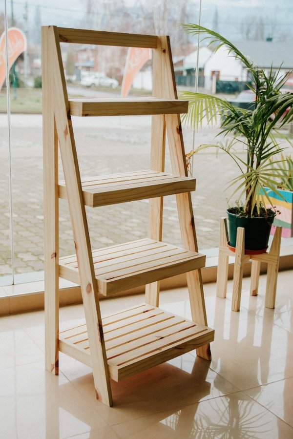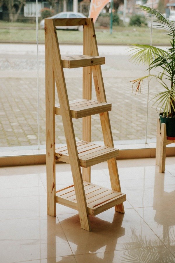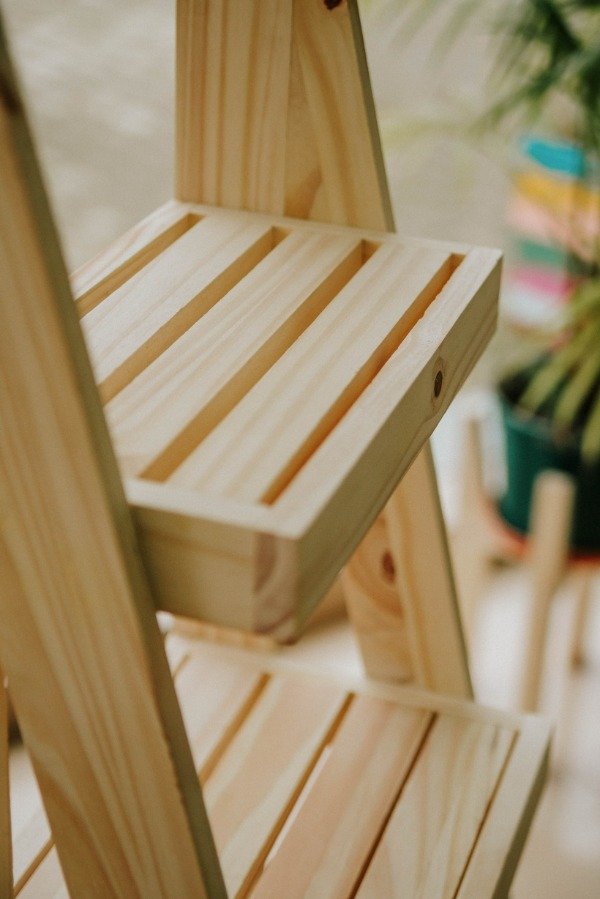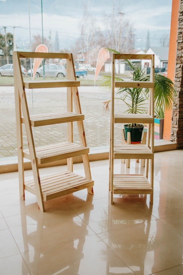 Esta estanteria cuenta con la estética distintiva de una escalera decorativa. Fabricada en madera de pino, destaca por su diseño escalonado que no solo ofrece múltiples niveles de almacenamiento, sino que también añade un toque único y moderno a cualquier ambiente. El "estante deck" se refiere probablemente a una repisa más profunda o destacada en alguno de los niveles, ofreciendo espacio adicional o un punto focal para exhibir objetos. La calidez natural de la madera de pino, con sus vetas y nudos, aporta un aire rústico y acogedor al diseño.