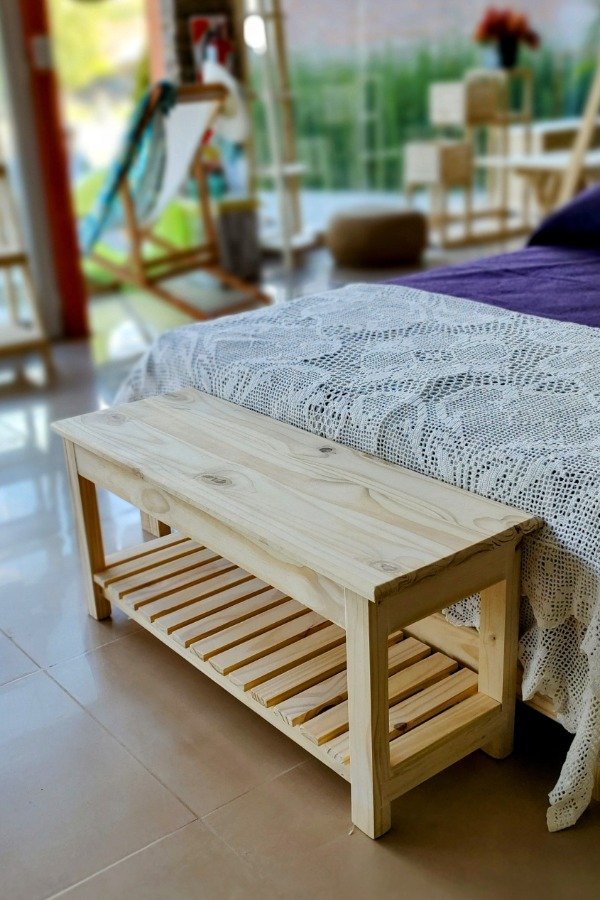 Banco de Pino Moderno con Estante Deck: Diseño Adaptable